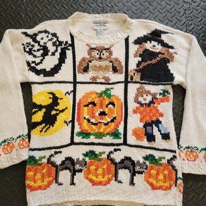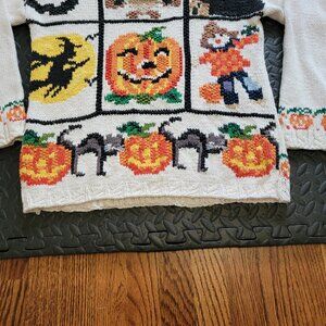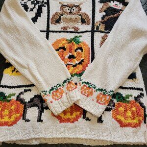 Item: Vintage Halloween Knit Sweater featuring a great pattern design of Pumpkins, Ghosts, Witches, Black Cats, a Scarecrow on the front of sweater. There is a repeating pattern of pumpkins on each sleeve cuff, and along the waist on the back of the sweater. Nice quality loose knit sweater. Fairly heavy as it is nice quality. Crewneck. Pullover. Long Sleeves.