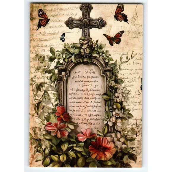 This exquisite vintage Halloween postcard features a beautifully detailed lithograph of a decorative cross surrounded by lush flowers and vibrant butterflies. The design showcases a classic photochrome printing technique, popular from 1939 to the present, which lends the postcard its rich colors and depth. The central cross is framed by verdant greenery and various blossoms, with delicate script text enhancing the antique aesthetic.
