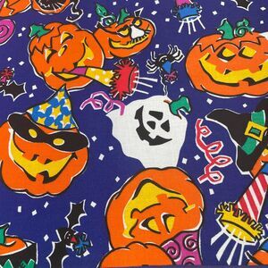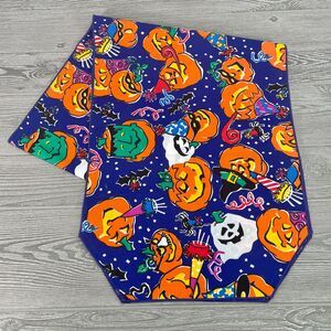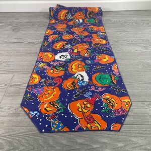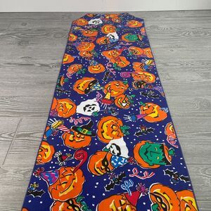 This amazing table runner is perfect for any halloween party. Serve spooky drinks or snacks on a table that is jazzed up with this. It's a bright, vibrant purple-blue color covered in a fullprint pattern of partying pumpkins and jack-o-lanterns wearing all sorts of costumes and party hats. There are ghosts, frankensteins, and more! A great find that is hard to come by!