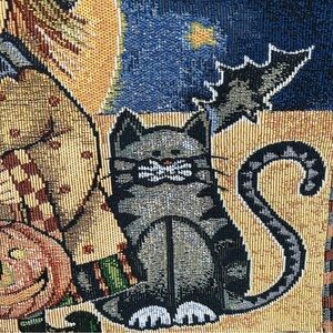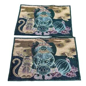 Whimsical vintage Halloween tapestry placemat set (2). Featuring a scarecrow, a cat, pumpkins, bats and stars. Good preowned condition!