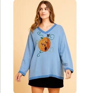 Make this season extra fun with this one-of-a-kind Coastal Grandma sweater! This classic oversized sweater features a vintage Halloween Jack O Lantern pumpkin design made of shiny sequins for the perfect spooky finish.