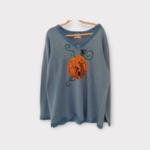 Vintage Halloween Sequin Jack O Lantern Pumpkin Coastal Grandma Oversized Sweater XL