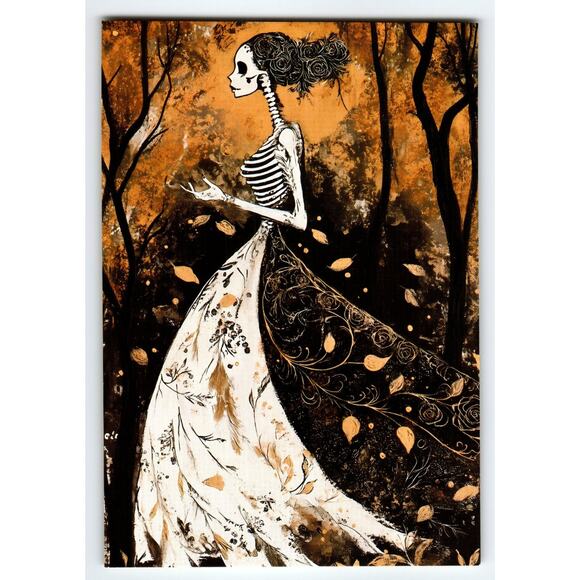 This striking Halloween-themed postcard features a beautifully illustrated skeleton lady adorned with an elegant flowing gown decorated with floral patterns. The artwork masterfully blends shades of black, white, and orange, evoking an autumnal forest backdrop with swirling leaves and bare trees. The intricate detailing in the skeleton's hair, styled with roses, adds a unique gothic charm to this piece. Printed using the photochrome lithograph technique, this postcard showcases vivid colors and a chrome finish that enhances its visual depth and appeal.