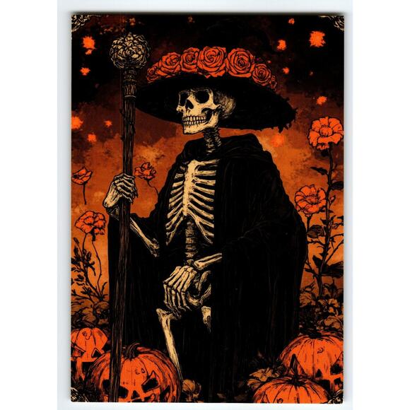 This striking vintage Halloween postcard features a detailed skeleton figure adorned with a wide-brimmed hat decorated with roses, holding a staff surrounded by jack-o'-lanterns and blooming flowers. The artwork is rendered in rich orange and black tones, evoking a spooky yet artistic holiday ambiance. The postcard is a printed lithograph with a photochrome finish, giving it vibrant color depth and a glossy chrome effect that enhances its collectible appeal.