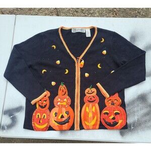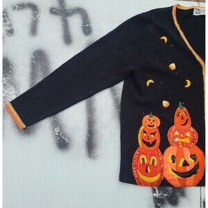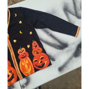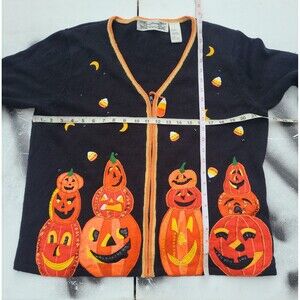 Vintage Halloween Sweater Zip Cardigan Light Up Pumpkins Candy Corn
