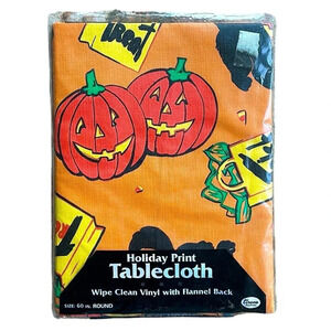 Vintage Halloween Vinyl Flannel Back Round Table Cloth New in Package Spooky Fun