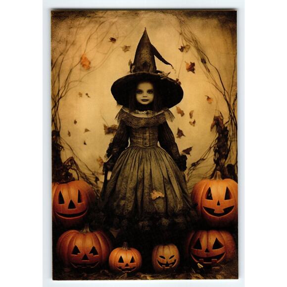 This captivating vintage Halloween postcard features an eerie young witch dressed in a detailed, old-fashioned gown and a tall, pointed hat. She is surrounded by seven classic jack-o'-lanterns carved with various spooky expressions, set against a backdrop of twisted, bare branches and scattered autumn leaves, evoking a mysterious fall evening atmosphere. The rich sepia tones and intricate lithographic printing showcase the photochrome technique popular from 1939 onward, adding depth and a subtle glossy finish to the image.