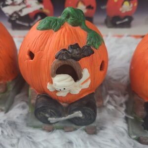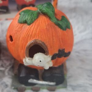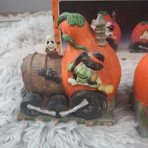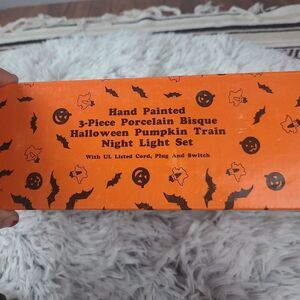 Vintage Halloween Pumpkin Train Porcelain Bisque 3 Piece 1990's Hand Pai…