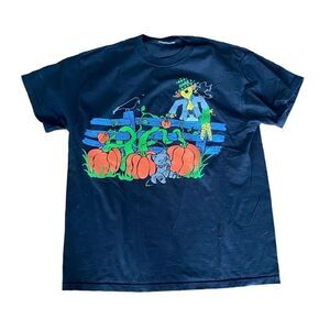 Vintage Halloween Tshirt. The size tag is missing, but I think it fits like a large (see measurements). The shirt has some minor cracking on the graphic, but overall in nice shape.