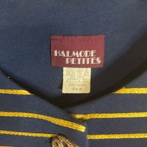 Excellent Vintage Halmode Petites long sleeve dress. Navy blue with gold accents. Button down front. Faux pockets with gold accents. Very sophisticated, classic vintage style. 70% acrylic and 30% polyester. From non-smoking home. (A-13)