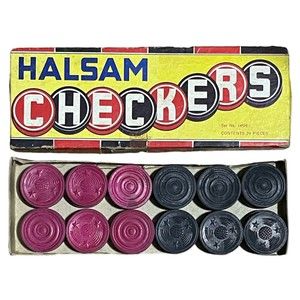 This vintage Halsam embossed wood checkers set includes all 24 original pieces and comes in the original box (#145H). The set is perfect for 2 players and features a classic checkers game type.