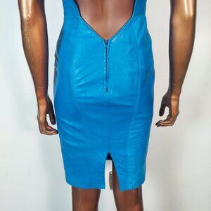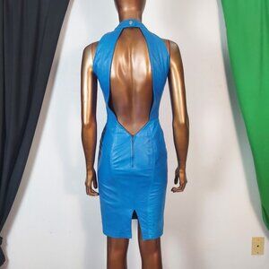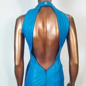 Michael Hoban for North Beach Leather. Set yourself apart in vibrant blue, sumptuous soft leather from North Beach. This dress features halter top with snap closure; low-cut open back; knee length skirt with rear slit; and a rear zipper closure.