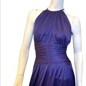 Vintage 1970s halter pleated ruched dress. This elegant purple dress is made from a high-quality jersey knit.