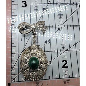 This is a beautiful vintage Hamilton brooch watch with locket design, dating to the 1950s–60s. The ornate filigree case is marked 800 silver and features a genuine green malachite cabochon on the front, with a bow brooch top.