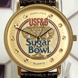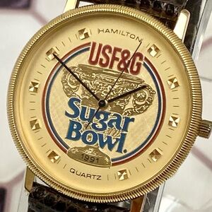 Rare vintage Hamilton 1991 USF&G Sugar Bowl watch NCAA Football Univ. Tenn Univ. VA. This may have been a watch issued to players but not sure. The game was played in New Orleans on January 1, 1991, with Univ. of Tenn. defeating UVA. Watch is small for a man's by today's standards. Please ensure size works for you before purchasing. Watch features a gold-tone case with coin edge bezel and the Sugar Bowl logo with "1991" on the dial. Dial is marked, "Hamilton, Quartz," and case back is marked, "(c) Hamilton, 8704, Base Metal Bezel, Stainless Steel Back." Watch has a 7-jewel Swiss movement. The watch case measures approx. 33mm across excluding crown, and watch with vintage genuine lizard strap measures approx. 9" (max wrist size of approx. 7 1/4"). Watch is in good vintage condition for its age with a scratch-free crystal and light scuffs/scratches to the case. The NOS lizard strap is not original to the watch. Watch has a new battery and keeping time. Great collectible watch! Thanks for checking out my closet!