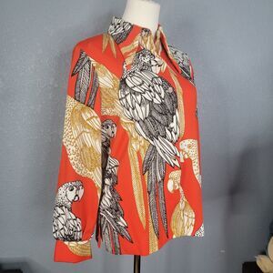 Beautiful vintage Hamilton Dallas blouse featuring a bold parrot and feather print in vibrant red-orange, gold, white, and black. Pointed collar with long sleeves and single-button cuffs. Fabric feels like polyester, soft with a smooth finish. Runs small despite being marked as vintage size 8. Likely best for a modern Small.