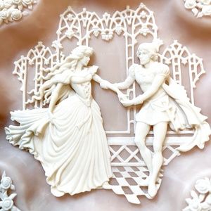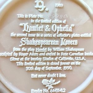 Vintage Hamlet and Ophelia Collectible Plate by Incolay Studios. Gorgeous 3D detailing with roses, gables, characters, and more. This is a limited edition collector's plate. The plate is number 9898B in the limited edition of Hamlet and Ophelia. It is the second issue from the 1989 "Shakespearean Lovers" series from the play Hamlet. Sculpted by Roger Akers and crafted in rose carnelian incolay stone at the Incolay Studios in California. It measures approximately 8.5" in diameter. I have another plate in my closet. Bundle and save on price and shipping. Excellent condition.