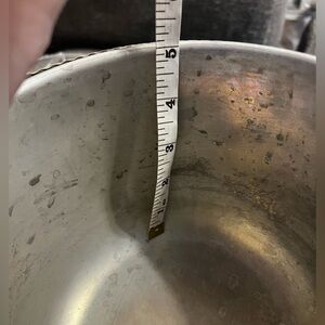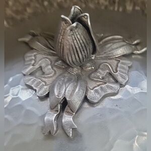 This vintage ice bucket is a stunning piece of art nouveau design in aluminum. The round shape features a beautiful rose bud floral trim and hammered texture. Measuring 8.25 inches in width and 11 inches in height (with lid), it is the perfect size for any occasion.