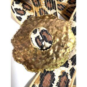 Vintage Hammered Brass Floral Belt Buckle Leopard Print Adjustable Fabric Strap