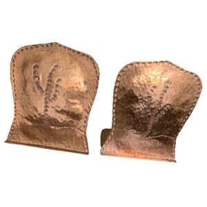 These vintage hammered pair copper bookends feature a rustic tree motif, embodying a Mid-Century modern style with a hint of Brutalism. Handcrafted from hammered copper, these unique bookends are perfect for all occasions and are sure to add an artsy touch to any bookshelf. The intricate design and hammered finish make them a standout decorative collectible for adults who appreciate handmade items with a touch of history and character.