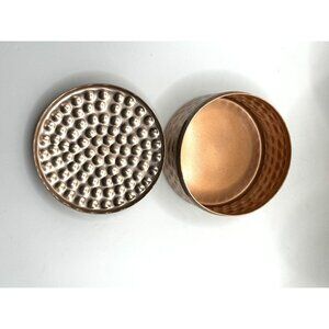 Elegant vintage hammered copper candle holder with a secure lid. Features a unique textured design.