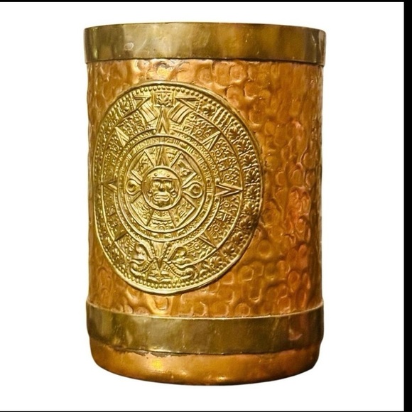 Vintage Hammered Copper and Brass Mug with Mayan Calendar