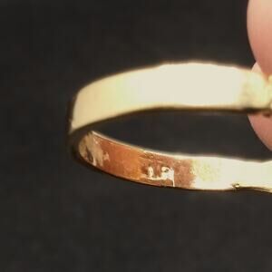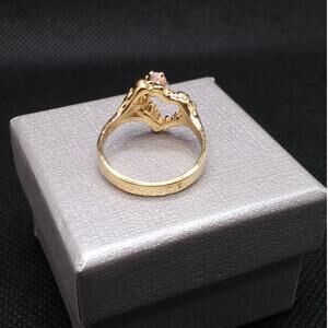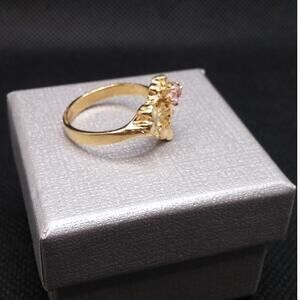 This is a rare, vintage ring with an Art Nouveau design. It features a hammered heart shape with a pink, faceted cubic zirconia stone. The ring is a gold nugget style in a gold tone and is in excellent condition. It's a unique and beautiful piece of jewelry that would make a great addition to any collection.