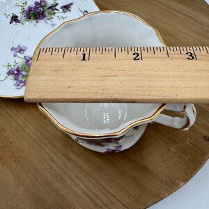Elegant "Victorian Violets" tea cup and saucer set from Hammersley, featuring delicate purple floral patterns. Perfect for collectors or as a charming addition to your tea time.