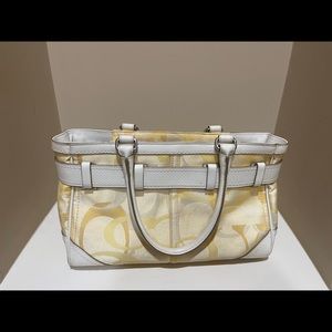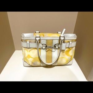Very used Yellow Leather and Fabric y2k Coach purse from the Hampton collection. Like I said it is very used condition but still is very usuable and has a lot of life left in it.I have pictured the spots on it. The zipper is fully functional and it is reasonably clean inside for its age. It does have some pen marks on interior that I have also pictured as well. Any other questions please hit me up :) thanks!