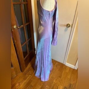 Stunning vintage purple blue iridescent halter maxi dress. The perfect fairycore dress with a matching scarf to go with it. The colors are even more beautiful in person! Could use a good steam to get the wrinkles out but otherwise no stains or rips. There are some very small pulls in the dress which I included in the photos, but you cannot see them at all unless you are up close to the dress. This comes from a smoke free, pet friendly home.