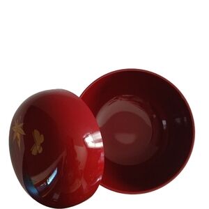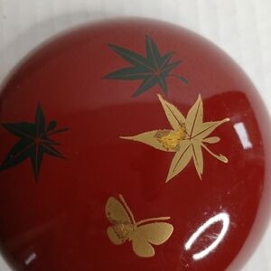 A round trinket box bowl + lid lacquered design gold Butterfly and leaves.