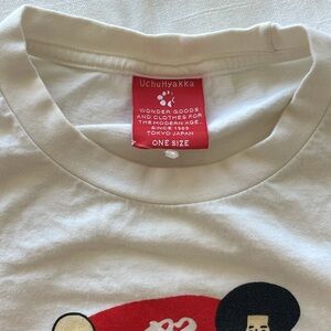 Rare graphic tee featuring artwork from Hanakuma Factory, designed by Japanese illustrator Yūsaku Hanakuma (known for his quirky “Afro & Baldie” characters). The shirt was originally sold through Uchu Hyakka, a Japanese novelty & streetwear shop known for its playful, kitschy fashion pieces.