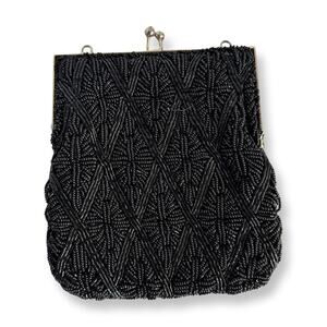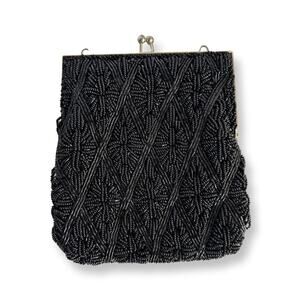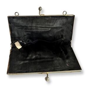Vintage, hand beaded in a diagonal cross cross pattern with black satin inlay, hinge opening and silver plated with loops for attaching a handle or strap