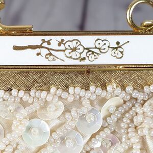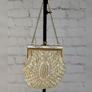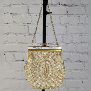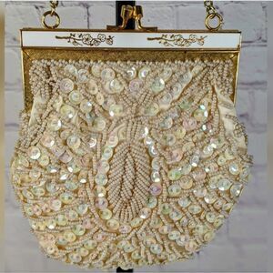 Intricate hand beaded clutch purse by Laura. Cream and ivory hand sewn sequins and beads make this a truly one of a kind evening clutch.