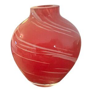 Vintage Hand Blown Art Glass Bud Vase Swirled Red & White 3" X 3.5" Decorative