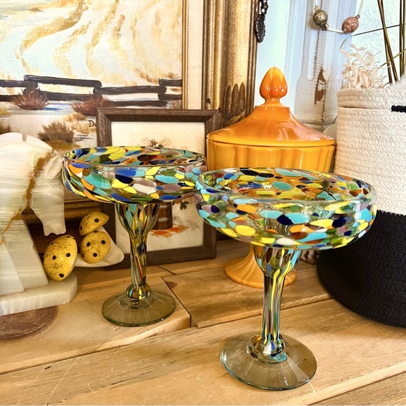 Vintage Hand Blown Confetti Margarita Glasses Set of 2 Hand Crafted 12oz
