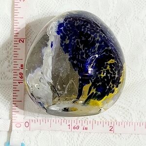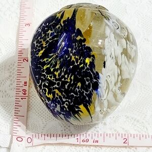 This beautiful little paperweight has a classic silhouette, a brilliant color scheme, trio of white, yellow and blue with controlled bubble details.