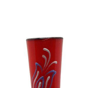 Vintage Hand Blown Red Glass Vase with Hand Painted Enamel Flowers & Cased Metal Rim 8 3/4" H 8 3/4" H X 2 1/2 W @ base