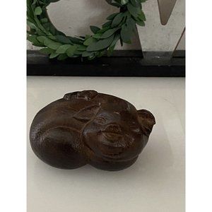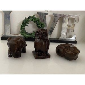 Vintage Hand Carved Dark Brown Solid Wood Elephant Owl and Pig Figurine Set of 3