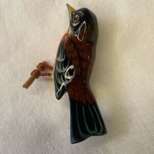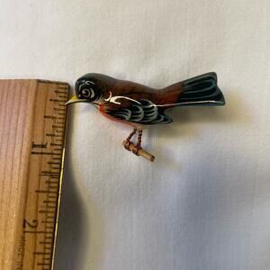 This bird is a robin. It has reds, turquoise, blacks, whites, yellows. Each bird is hand crafted and painted; therefore, each pin is unique. The legs are made from twisted copper wire and the branch is wood. The back of the brooch is signed (K.T.). The pins in the back are push pins. The pin measures 2 in. x 1 in. This pin is in excellent condition.