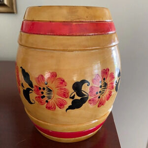 Vintage Hand Carved & Hand painted Floral Wooden BARREL CANISTER Bank USSR