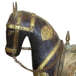 Vintage Hand Carved Marwari War Horse Figurine - Brass Armored Metal Detail 6.5" x 5.5". Stunning detail and a true work of art! Because of its age, there is Verdigris on parts of the saddle. Also, it is common for the tail to look like it's cracked, but it is made that way to prevent breakage. Verdigris is the common name for blue-green, copper-based pigments that form a patina on copper, bronze, and brass. A stunning hand-carved wooden Marwari war horse figurine with intricate brass armor detailing. This unique sculpture showcases expert craftsmanship, blending historical significance with artistic beauty. Standing 10 inches tall, it’s a striking addition to any equestrian collection or vintage decor. The rich wood grain and ornate brass accents make it a standout piece for collectors and history enthusiasts alike.