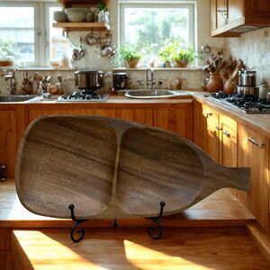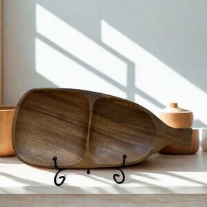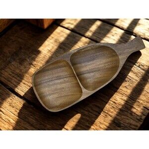 Bring a touch of retro island charm to your home with this vintage hand-carved monkey pod wood dish. Shaped like a bottle and divided into two sections, it's a perfect blend of function and formideal for serving snacks, displaying fruit, or simply as a statement piece for your mid-century or boho decor.