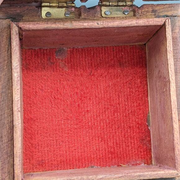 Vintage, Hand Carved, Ornate, Wooden Box, About 4 inches by 4 inches. Great for Storage, Trinkets or Jewelry. Hinged Lid, Red lining. I don't see any cracks or chips. See photos for measurements and details.