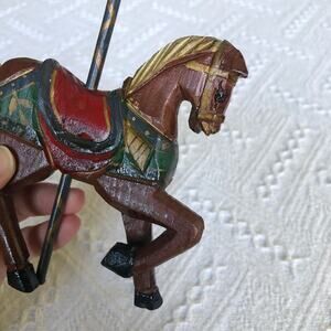 Keywords: merry go round, equestrian decor, handmade carving, folk art, holiday tree, collectible Christmas, circus carnival, old world style, painted wood figure, giftable dรฉcor