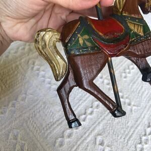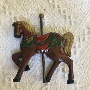 Vintage Hand Carved Wood Carousel Horse Ornament 5" Red Green Gold