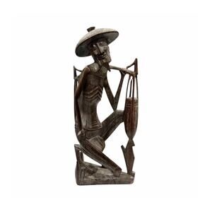 Excellent preowned vintage condition, this is a hand carved figurine in solid wood depicting a smiling working man. The man appears to be Asian and he is carrying two parcels. The figurine is kneeling on one knee. The carving has intricate detailing, including details of ribs, his smiling face And intricate details on his hat.  Stan said approximately 8 inches high and his approximately 4 inches wide. Truly a unique piece for any decor.