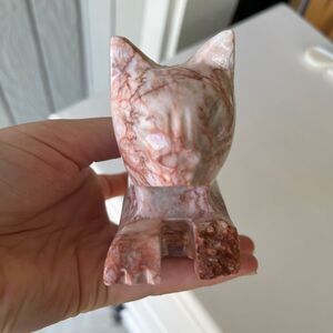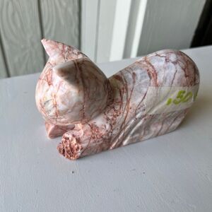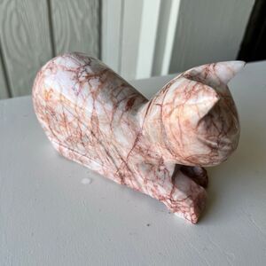 Beautiful hand-carved stone cat figurine featuring natural veining in shades of cream, red, and rust. The carving has a modern, minimalist style that highlights the organic beauty of the stone.