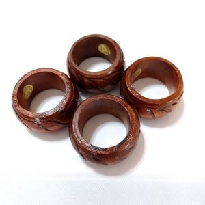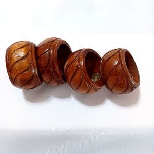 This set of 4 hand-carved teakwood round napkin rings are in good condition and have the original "Made in the Phillipines" sticker They measure approx 1 inch in height and approx. 1 7/8 inches in width. Please see all pics as they are part of the description. From a smoke-free and pet-free home.