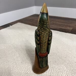 This vintage hand-carved toucan bird figurine is a unique collectible piece made of lightweight wood. With intricate carvings and a tropical bird theme, this medium-sized figurine is perfect for any room and any occasion. Handmade with a painted multicolor finish, this original piece adds a touch of authenticity to any decor. Displaying a toucan character in a tropical setting, this figurine is a one-of-a-kind addition to any bird-themed collection. Has a few scratches but nothing major!!